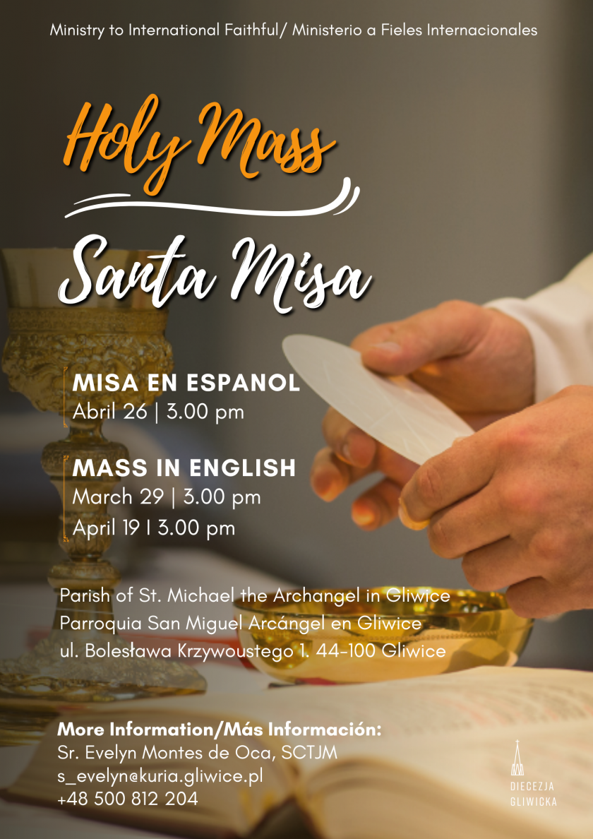 Si vives o trabajas en la Diócesis de Gliwice y deseas participar en la Eucaristía o recibir el Sacramento de la Reconciliación en español, eres cordialmente bienvenido.