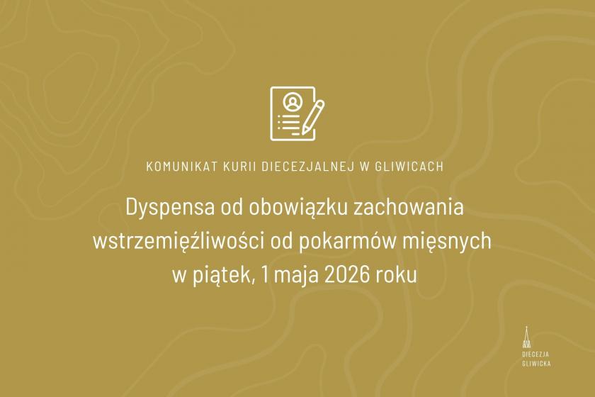 Biskup Gliwicki, mając na względzie dobro duchowe wiernych, udzielił wszystkim wiernym przebywającym w granicach Diecezji Gliwickiej w piątek 01 maja 2026 roku, dyspensy od obowiązku zachowania charakteru dnia pokutnego oraz wstrzemięźliwości od spożywania pokarmów mięsnych.