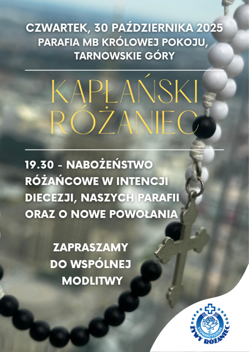 W duchu tej modlitwy kapłani Diecezji Gliwickiej zapraszają na Kapłański Różaniec, który odbędzie się w czwartek, 30 października 2025 roku, w parafii Matki Bożej Królowej Pokoju w Tarnowskich Górach.