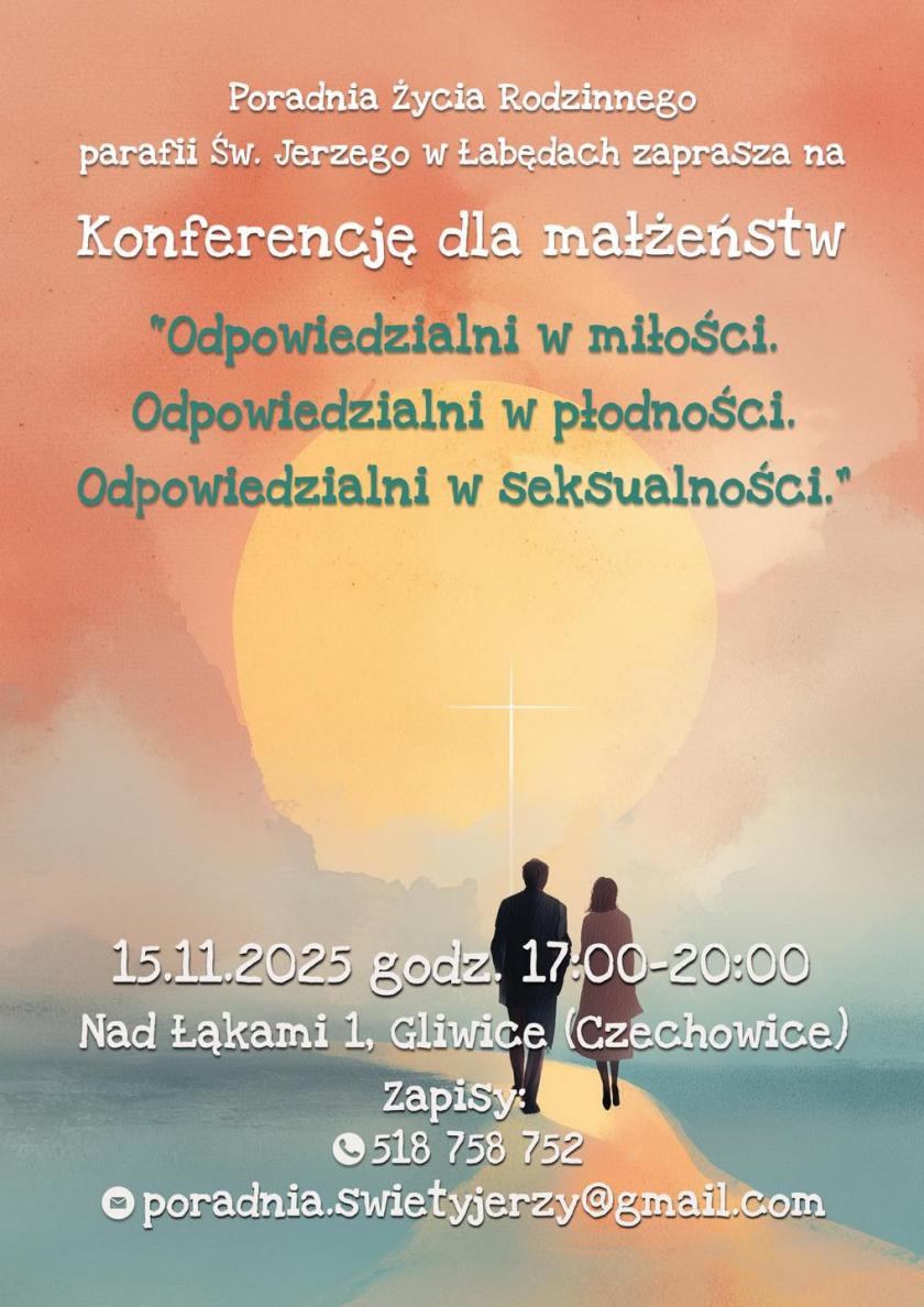 Poradnia Życia Rodzinnego parafii św. Jerzego w Gliwicach-Łabędach zaprasza na konferencję dla małżeństw zatytułowaną „Odpowiedzialni w miłości. Odpowiedzialni w płodności. Odpowiedzialni w seksualności.” Spotkanie odbędzie się 15 listopada 2025 roku w godzinach 17:00–20:00 w ośrodku Nad Łąkami 1 w Gliwicach (Czechowice).