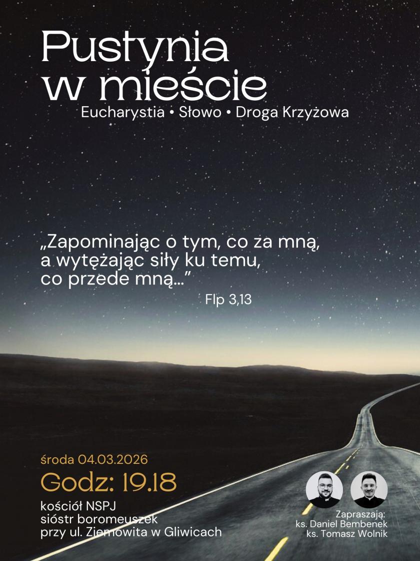 Na najbliższe spotkanie w ramach cyklu „Pustynia w mieście” zapraszamy wszystkich, którzy chcą zatrzymać się w ciszy, wejść głębiej w modlitwę i pozwolić, by Słowo Boże umacniało na wielkopostnej drodze. Wieczorna pora i spokojna przestrzeń kościoła Sióstr Boromeuszek pomagają skupić serce na tym, co najważniejsze.