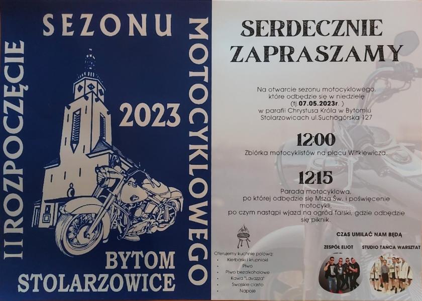 WSZYSTKICH zakochanych w dwóch kółkach - motorach i rowerach - zapraszamy 3. maja na Eucharystię z modlitwą o błogosławieństwo Boże dla motocyklistów i rowerzystów. Po Mszy św. poświecenie motocykli i rowerów oraz piknik w ogrodzie farskim z DJ-em ToJo. Będzie kuchnia polowa, swojskie ciasto, zimne i gorące napoje oraz konkursy i wspólna zabawa. Dla uczestników Zlotu do nabycia okolicznościowa blacha!