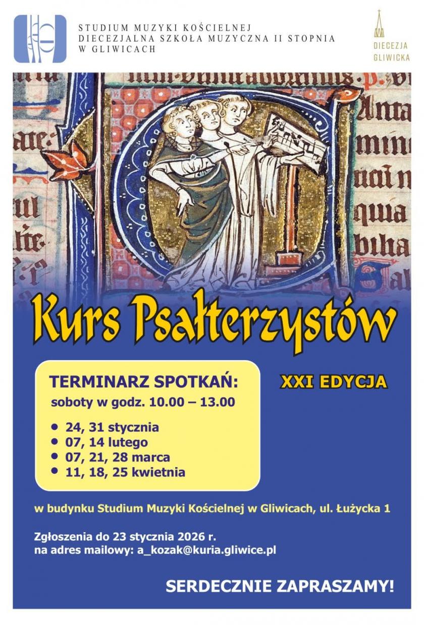 Studium Muzyki Kościelnej w Gliwicach zaprasza do udziału w XXI edycji Kursu Psalmistów. Spotkania będą odbywać się w soboty w godzinach 10.00–13.00 w budynku Studium Muzyki Kościelnej w Gliwicach przy ul. Łużyckiej 1.